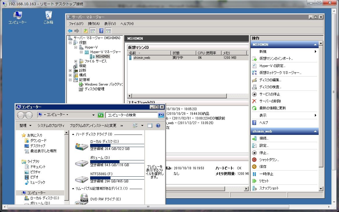 事務所LANに接続しリモートデスクトップでサーバーマネージャーで覗いたら webサーバーは一時停止状態になっていました。再開しても直ぐに一時停止になります。仮想サーバーを保存している場所の C:ドライブの残量が 1GBを切っていますから無理ないのでしょう。 何でこんなに少ないの?と調査したら vhdと avhdファイルが 20GB位に膨らんでします。