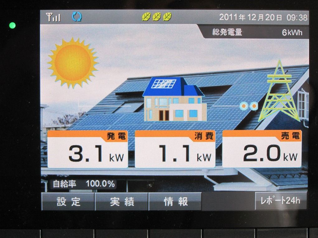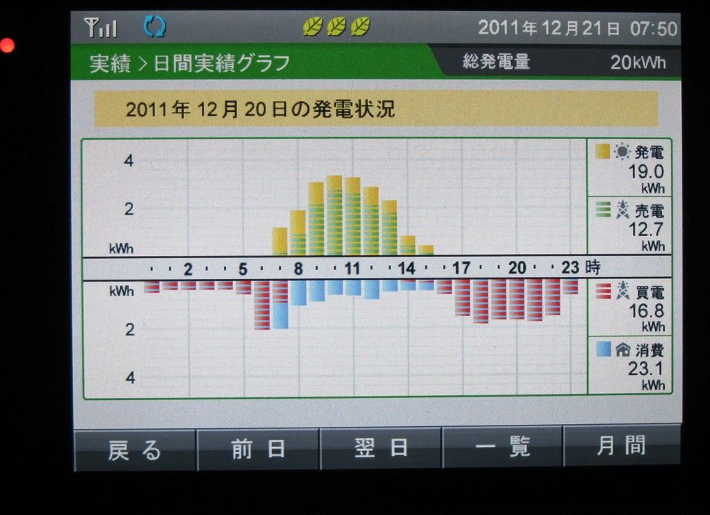 発電初日のサマリーです。一日全体を通しての総発電量19.0kWhは総消費量23.1kWh の82%を賄い、売買電力収支面からは42円x12.7+22円x6.3 =672.0円の減価償却が進みました。この日はたまたま日中ず~っと快晴でしたので例外的な好成績だと思った方が無難です。(ほぼ6年で償却が終わりますから)