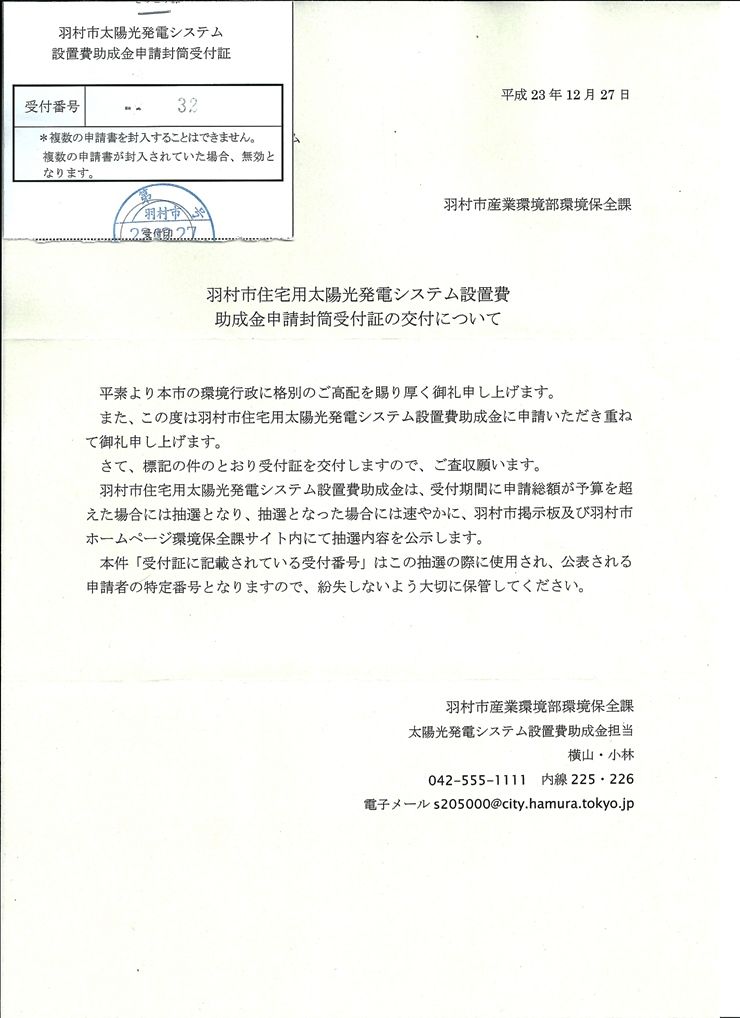 羽村市産業環境部から受付証が届きました。受付番号は32となっていましたが。これは2期分なのか通年の番号なのか? と、言うのは1期の時は29名の応募のなかから抽選で20名に支給した(つまり1期予算は100万円、ケチーッ)からです。2期も同じ予算規模だとすると 申請締切日までまだ1ヶ月あるこの時点での32名は大変狭き門だと言えます。