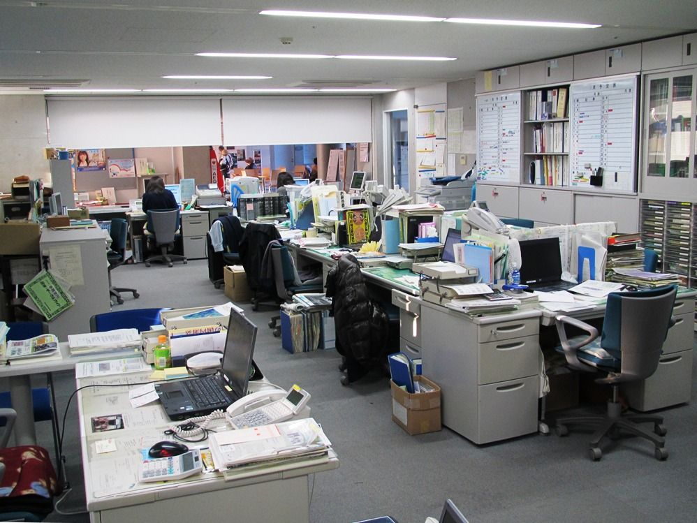 左手前がセンター長(課長)です。右手前の係長の前には机が2列に4つずつ並んでいますが、左列が行政職員、右列が市民の会事務局員です。 一番奥は貸館の予約の受付やチケット販売カウンターになっていて行政の臨時職員さんが交替で対応しています。