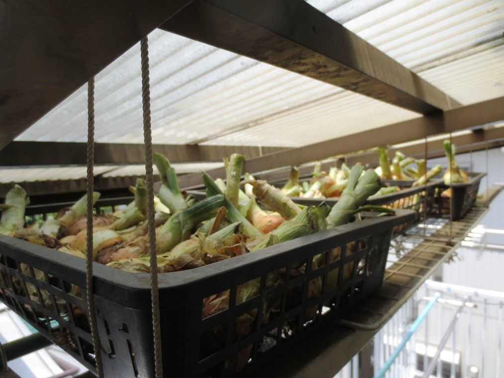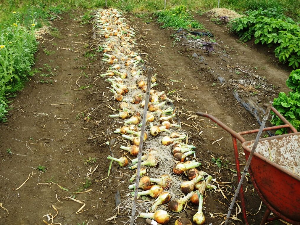 倒伏前ですが収穫を決断 丁寧に抜き、葉っぱ、根をカットして暫し乾燥させます