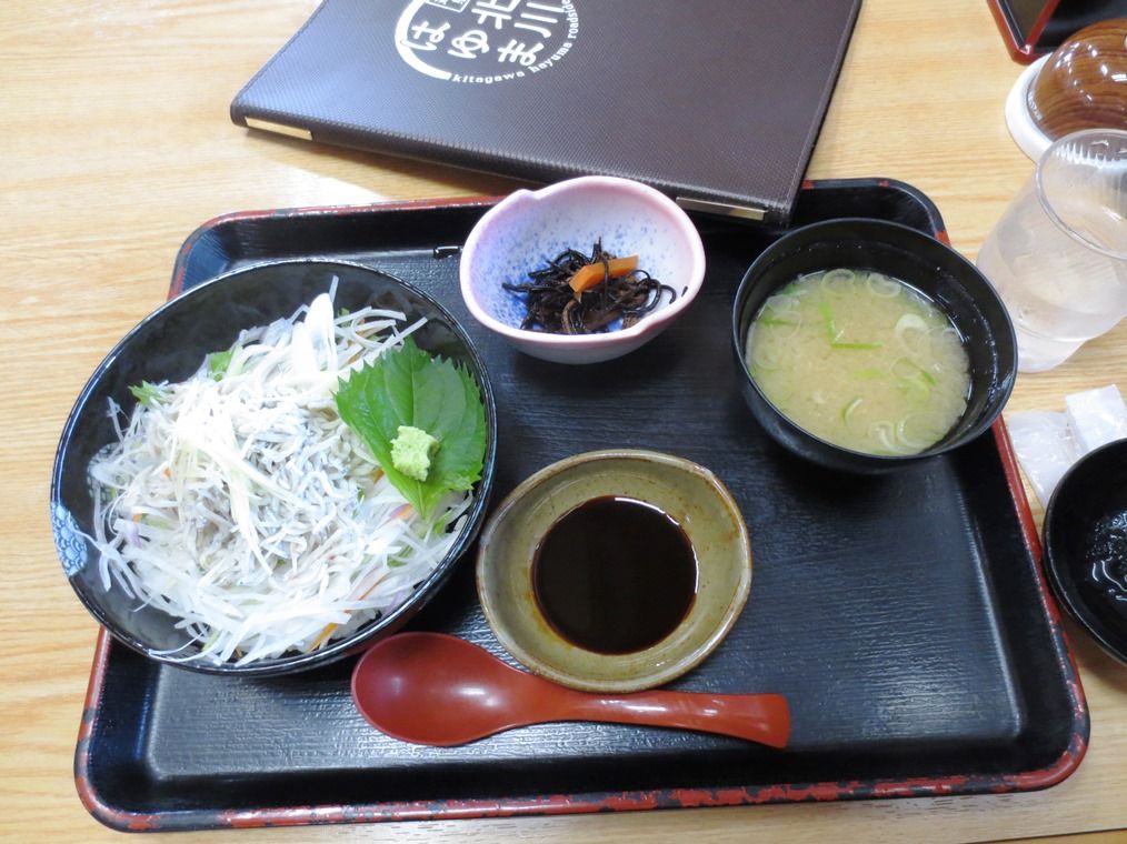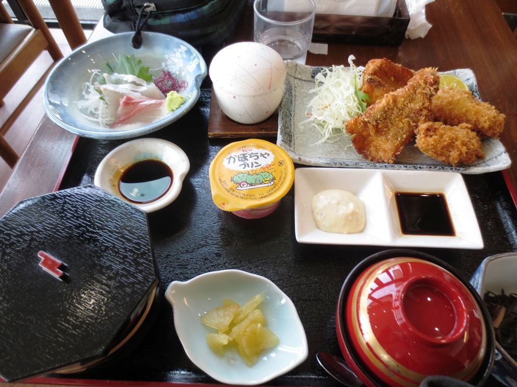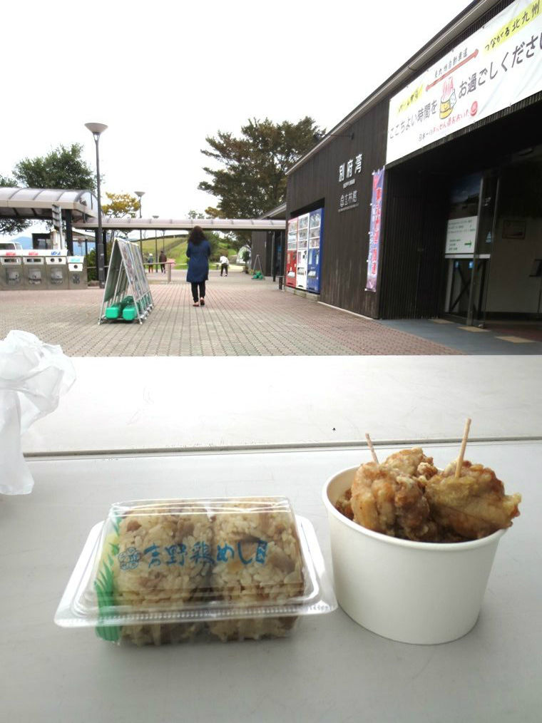 いよいよ九州です とり唐揚げととりムスビ しらす釜揚げはぱさぱさで