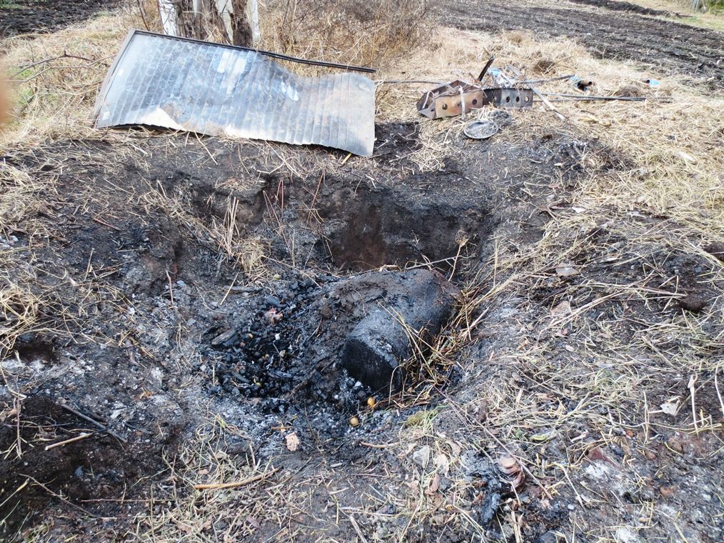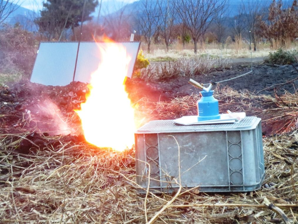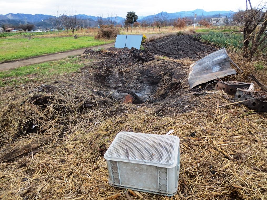 住宅街での焚火は条例違反になるので燃焼テストは農園の堆肥を作るための野菜屑、剪定枝、廃材の焼却処理穴で行いました。