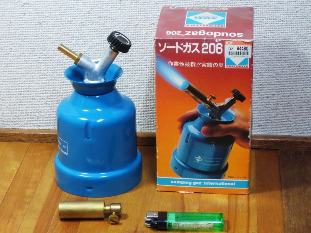 購入目的や時期は不明ですが着火すると立派に強力な炎が出ます。本体は既に自動点火装置付きの 206Aに改良されているようです。消耗品のカートリッジには互換性があり amazonから400円(税送込)位で入手可能です。