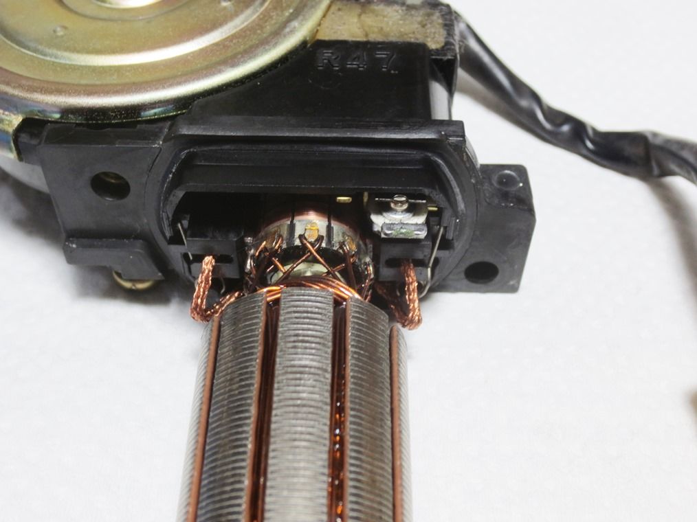 レギューレーターとガラスを入れて外部電源を接続しての動作確認でガラスが何かに噛んで 1/2以上持ち上がらない。そうこうしている内にモーターが突然回転しなくなり「逝ってしまったか」と真っ青に。モーターを再分解してテスターで電圧や導通を調べて行って「ワニ口ケーブルの断線」を突き止めた。そもそもデジタル信号用のケーブルを 最大12V10Aが流れる用途に使ってしまった作業ミスでした。ガラスはレールに斜めに入っていたようで、これも慣れからくるチャックミスと言えます。