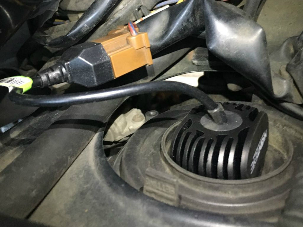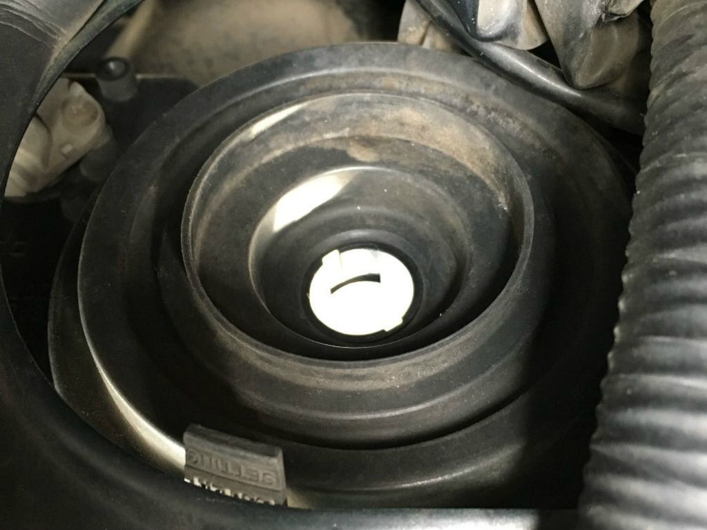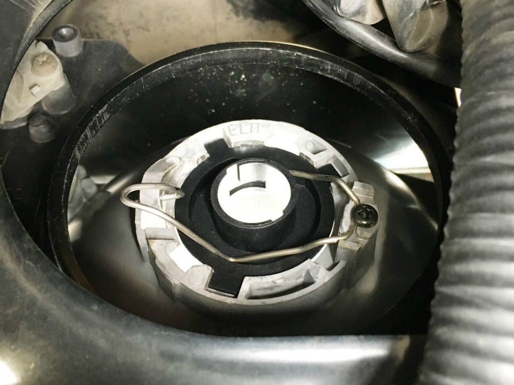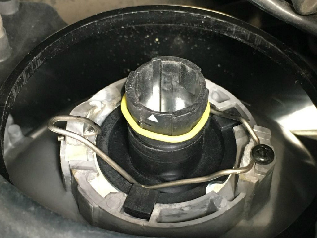 HID配線3本を切り離し後、HID本体を静かに抜きます。HIDソケット筒のOリングを落とさないように防水キャップを取り外します。(ラジエータ上から覗き込んで撮ったので画像の下側が上になります)