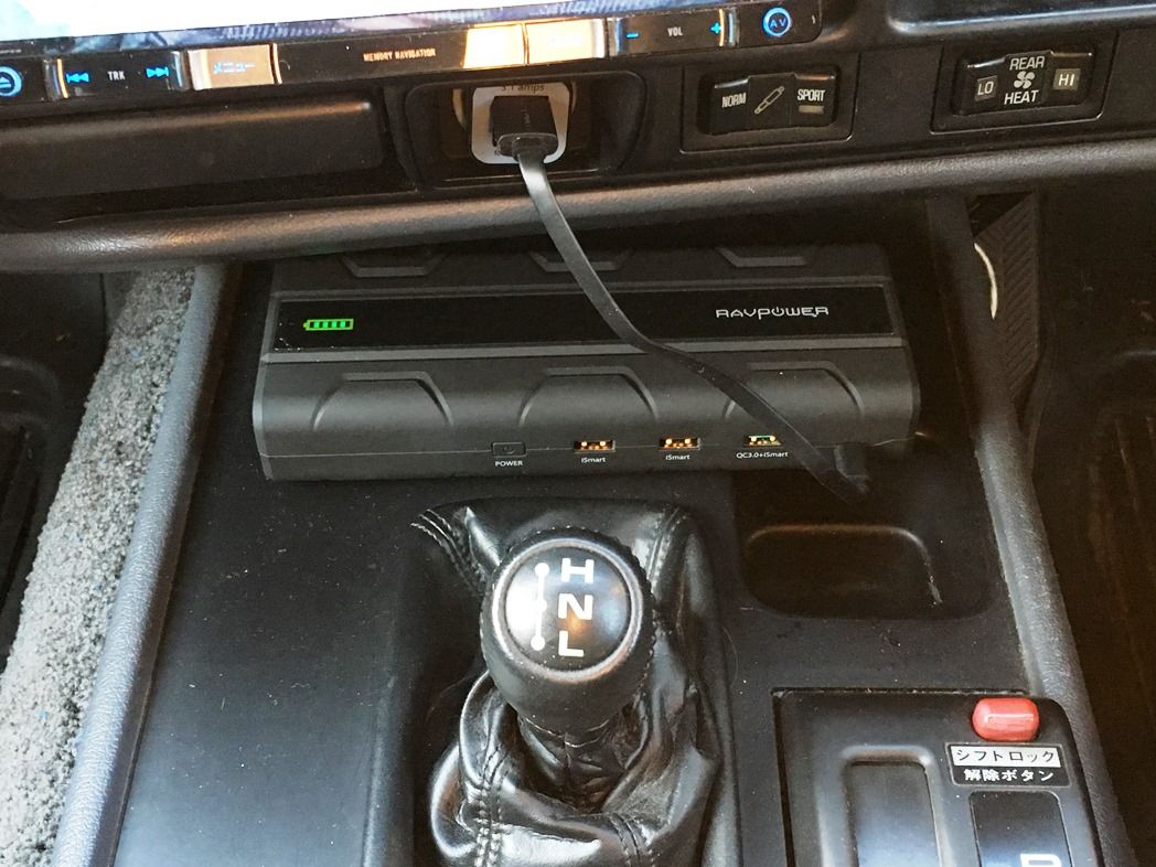 RP-PB063への充電はマイクロUSBで行います。本器への充電にはランクルの場合はセンターコンソールに置いてシガーソケットから、室内では付属のACアダプタで。 iPhone等への充電用に USBコネクタが 3ポート用意されています。