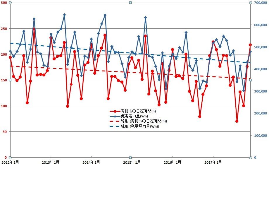 発電効率阻害要因を探るために日照時間との相関を分析しましたが、季節変動と見事にトラッキングしています。