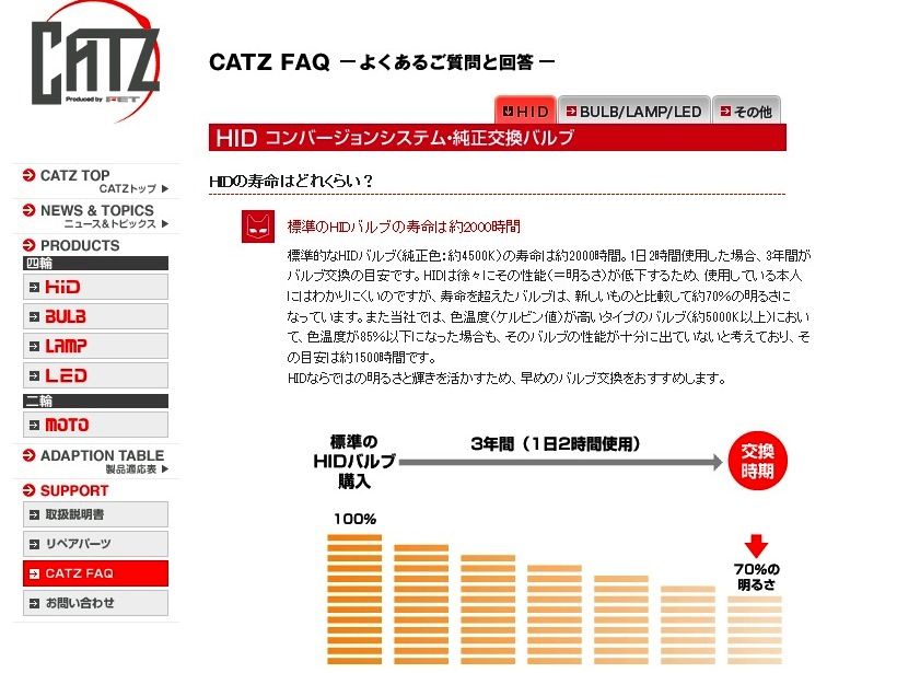 現在は 2004_07_11に導入したCATZ GALAXY WHITE(H4 HI/Lo 6500K)の HIDシステムをメインに使用していますが、FAQによるとHIDバルブの寿命はたったの 2,000時間しかない上にケルビン数の色温度が -85%になる 1,500時間がバルブ交換時期の目安、とのことでした。80での点灯時間の積算はしていませんが 13年、6.5万Km以上になり「暗くなった」等の症状はありませんが(HID純正交換バルブは 4万円以上するので)もうそろそろ後継バルブとしてLEDバルブの検討を始めました。