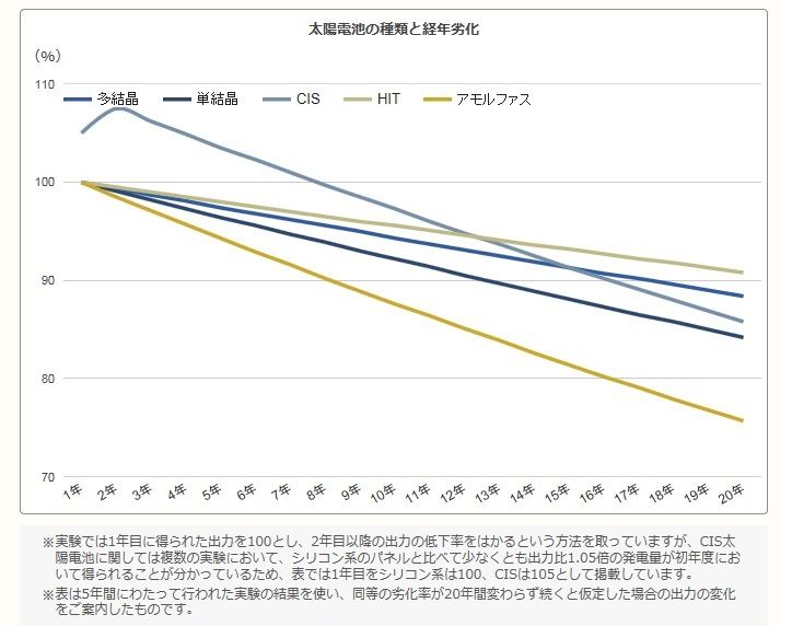 単結晶パネルの場合、5年で 3.2~3.9%の低下が報告されていますが、メーカー(T社)の10年で 90%、15年で 85%の出力保証の数字はなかなか考えられた数字だと思います。