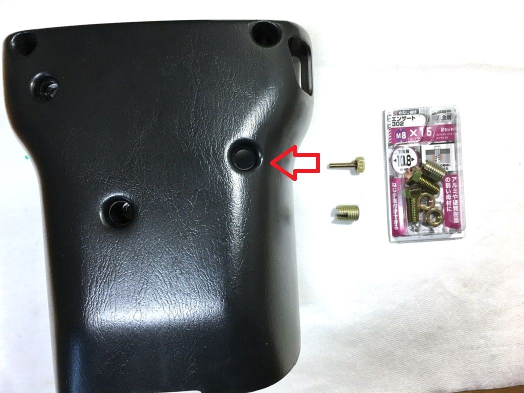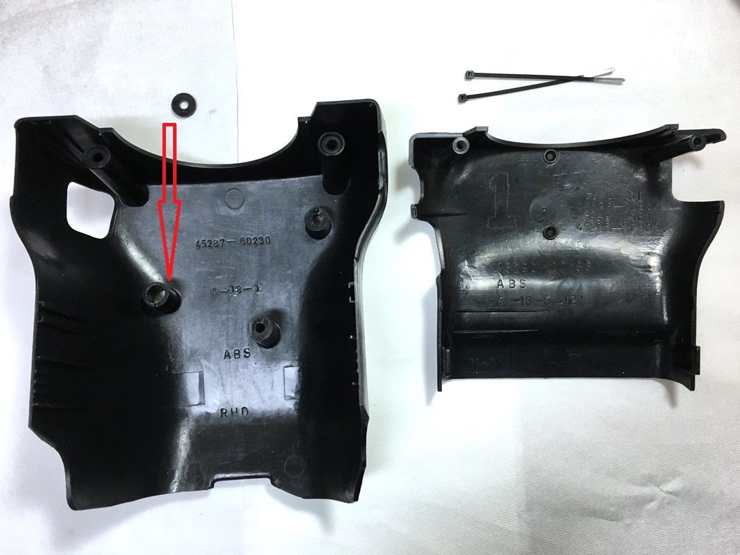 コラムカバー(45286-0938-01@4,260円)は上下共に経年劣化で強度低下している。今回疲労破断したロアー側は固定用M4ボルトの台座プラ部の替りにM6ナットを詰め込んだ。アッパー側固定のスクリューボルト 2本の受け軸はひび割れていたのでタイラップで締め付けておいた。