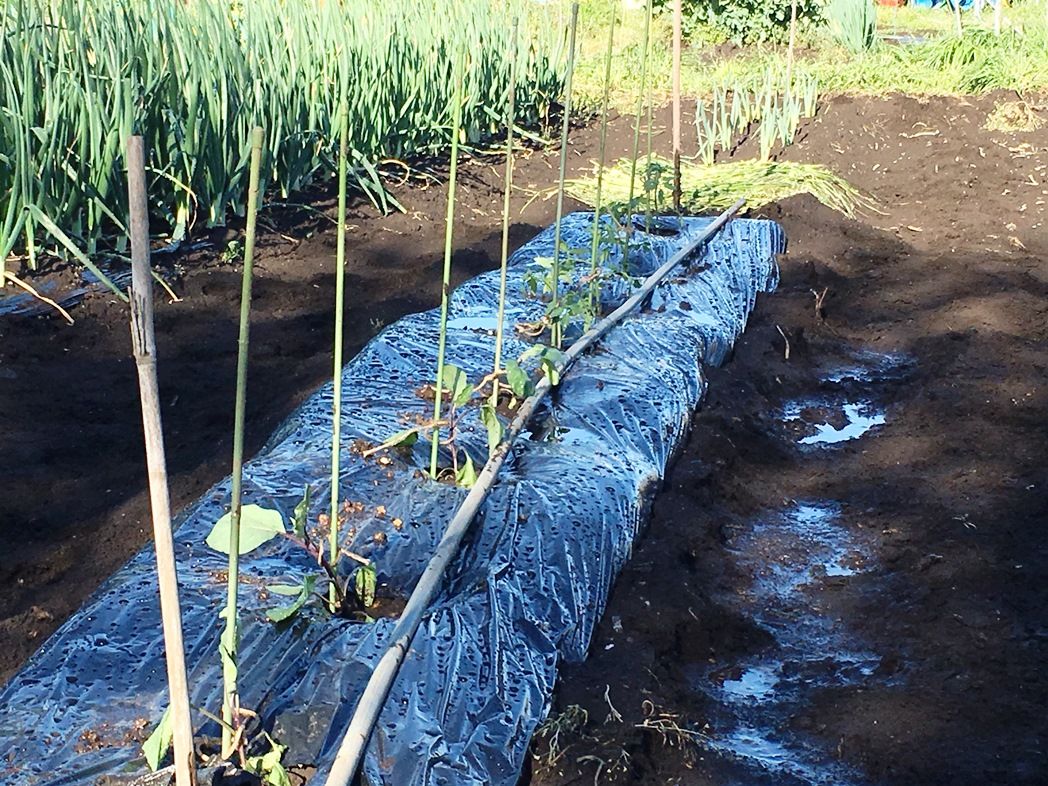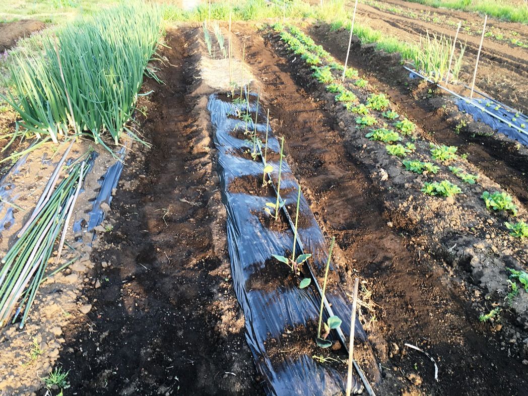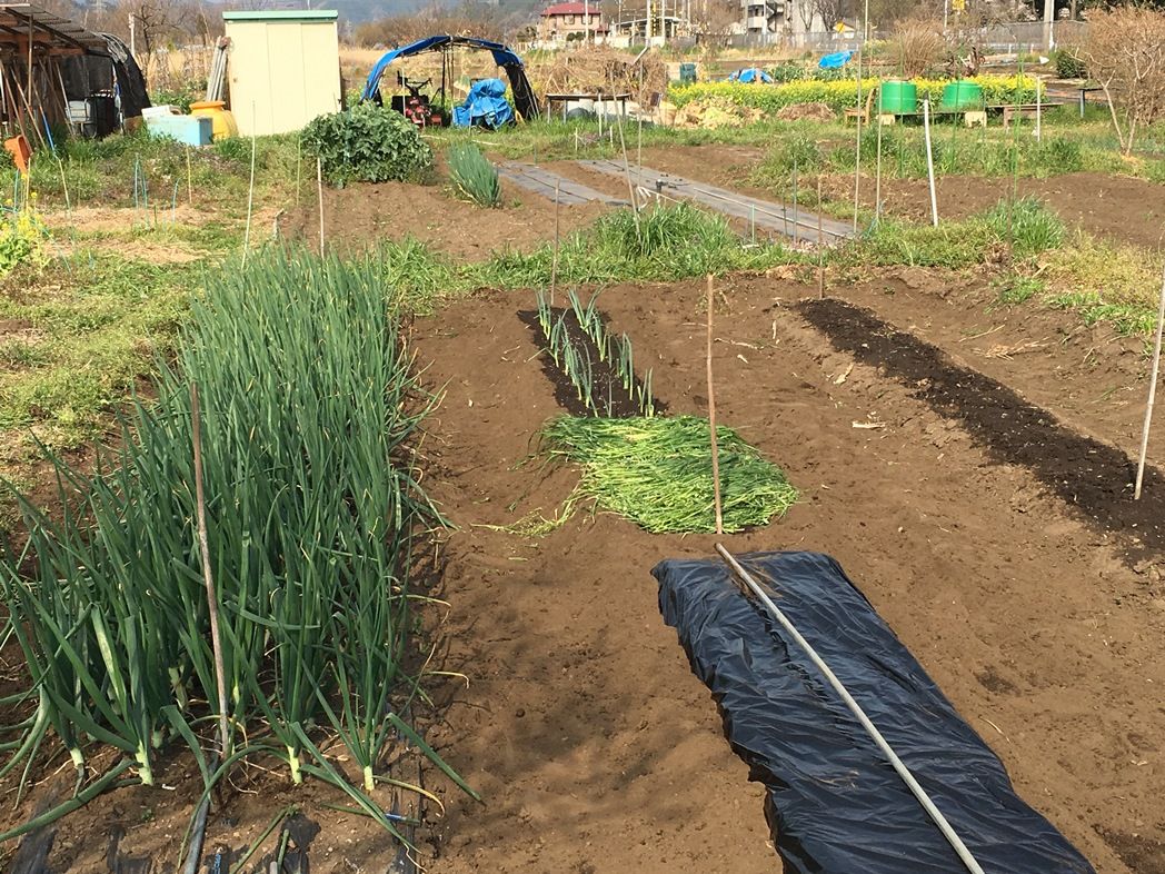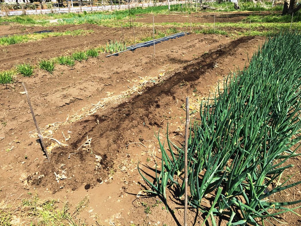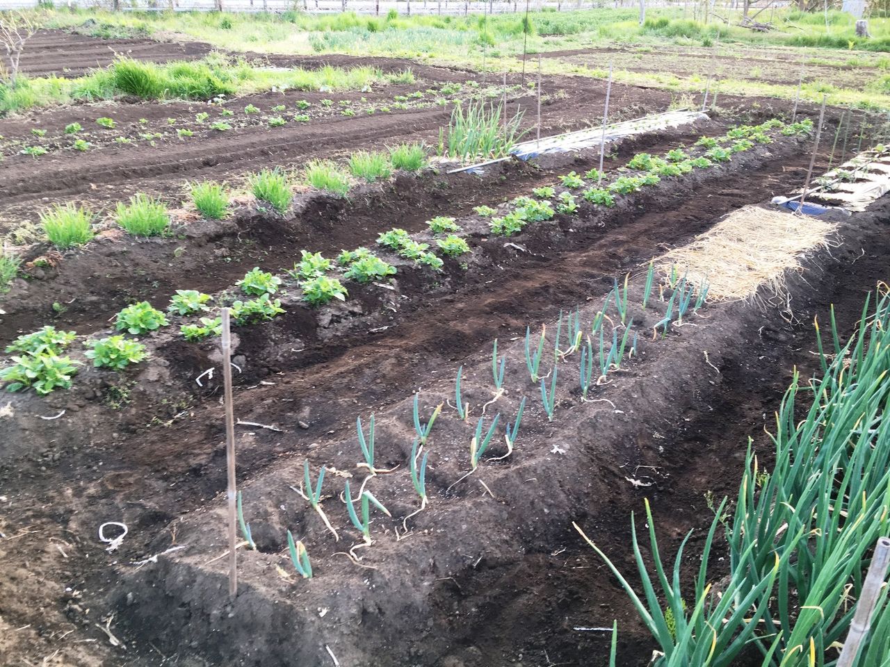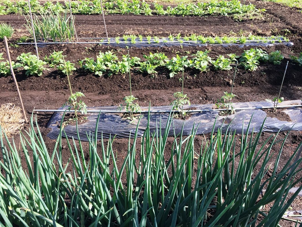 フロント周りの整備後の試走を兼ねて畑へ。 トマトの順調さに比べて茄子が心配。じゃが芋、春菊、ニラはすくすく。今年の玉葱はネギ坊主の発生もなく超大玉が期待できる。