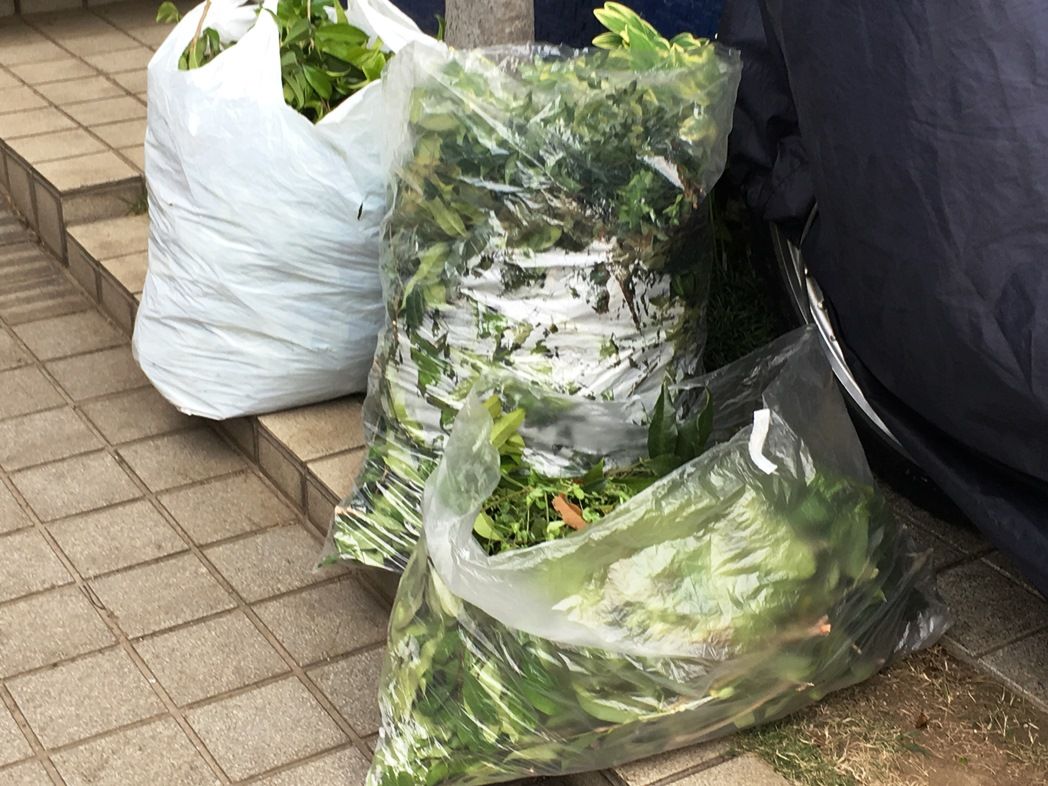 お隣りへの侵入部分のカットと全体を梳いてみただけで40L袋 2.5杯分の枝葉ゴミ。