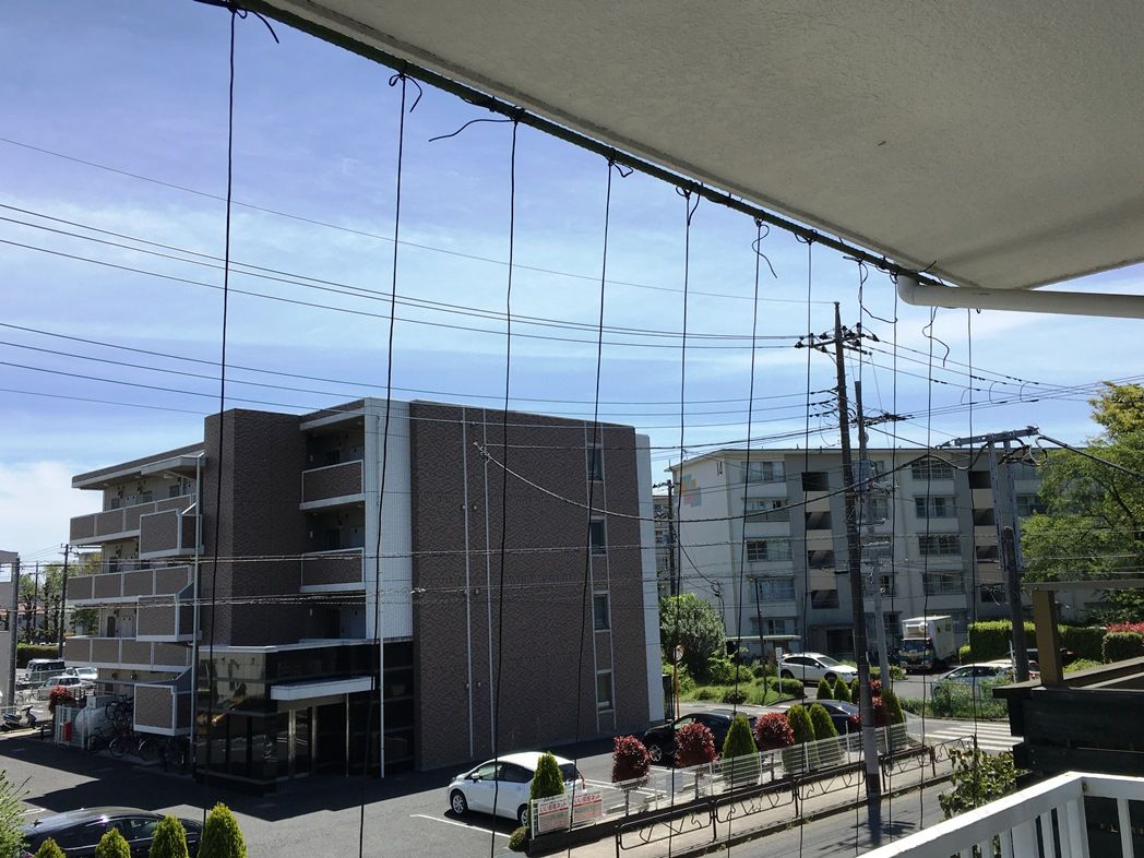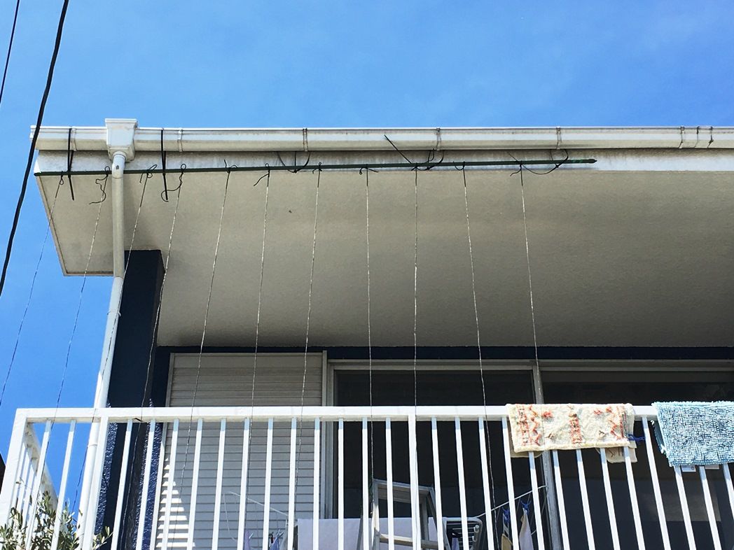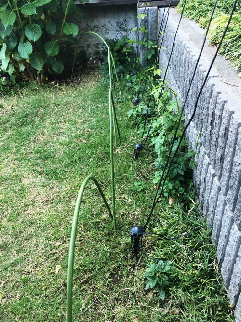 地面にペグx6本を打ち込み 11本の誘引ロープを横樋に渡した支柱まで引き回した。