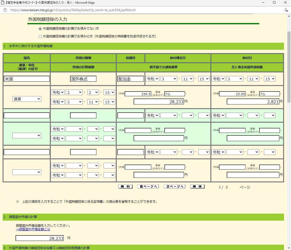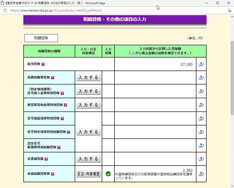 SBI証券では【源泉徴収税額(所得税)差引金額】警告が発生。これも「外国税額控除等」画面から外国所得税額(2,821円)や調整国外所得金額(28,233円)を入力し明細書で限度額(2,283円)から控除金額を算出して税額控除(2,382円)に漕ぎつけた。
