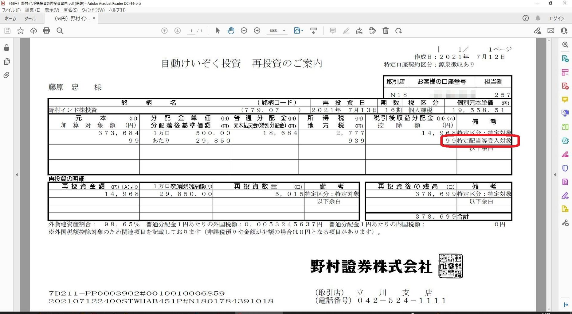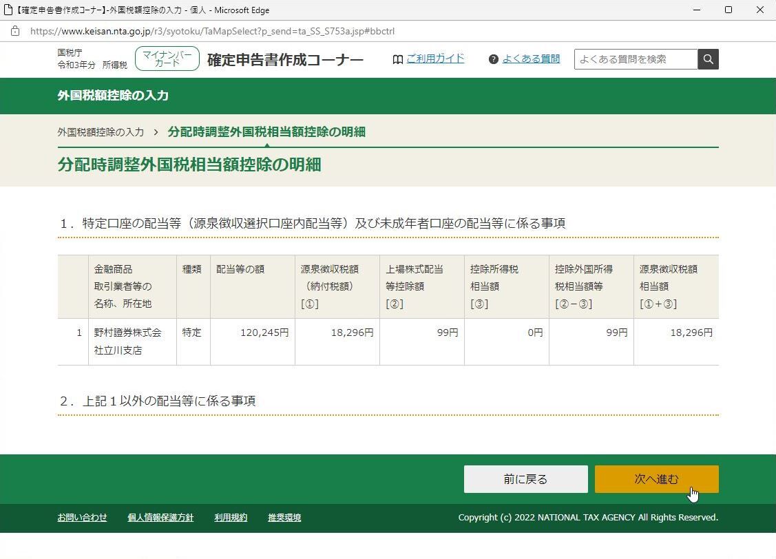 野村證券分は xmlデータで入力したがインド株投資の配当 99円が「外国税相当額控除」で警告が発生。