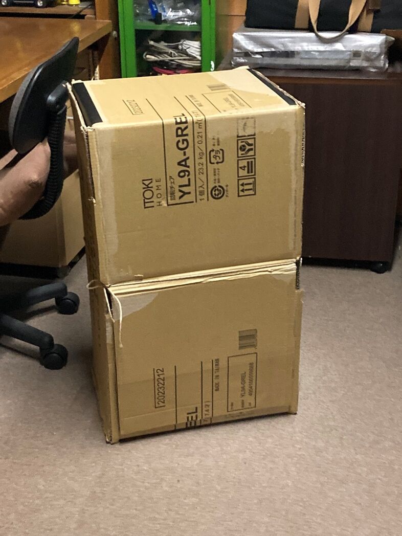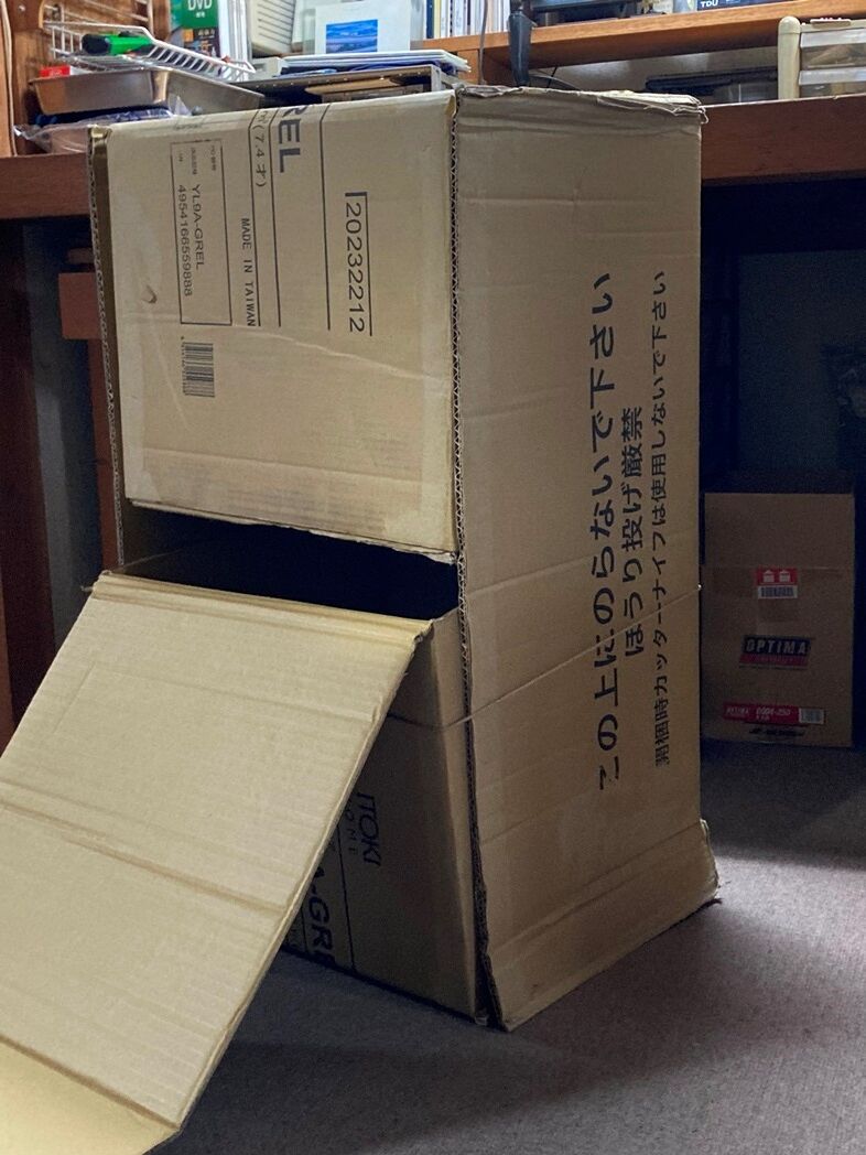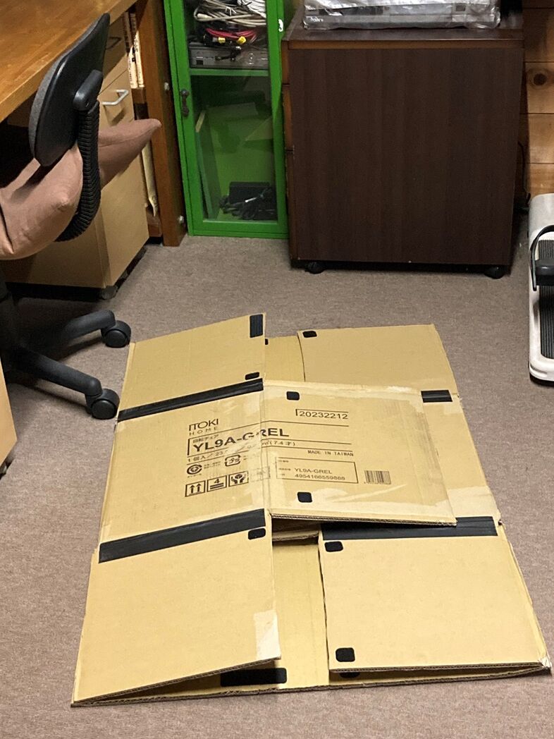 JOYFUL本田でいろいろ物色後、夏海が購入した OAチェアーの梱包廃材段ボールを試した。