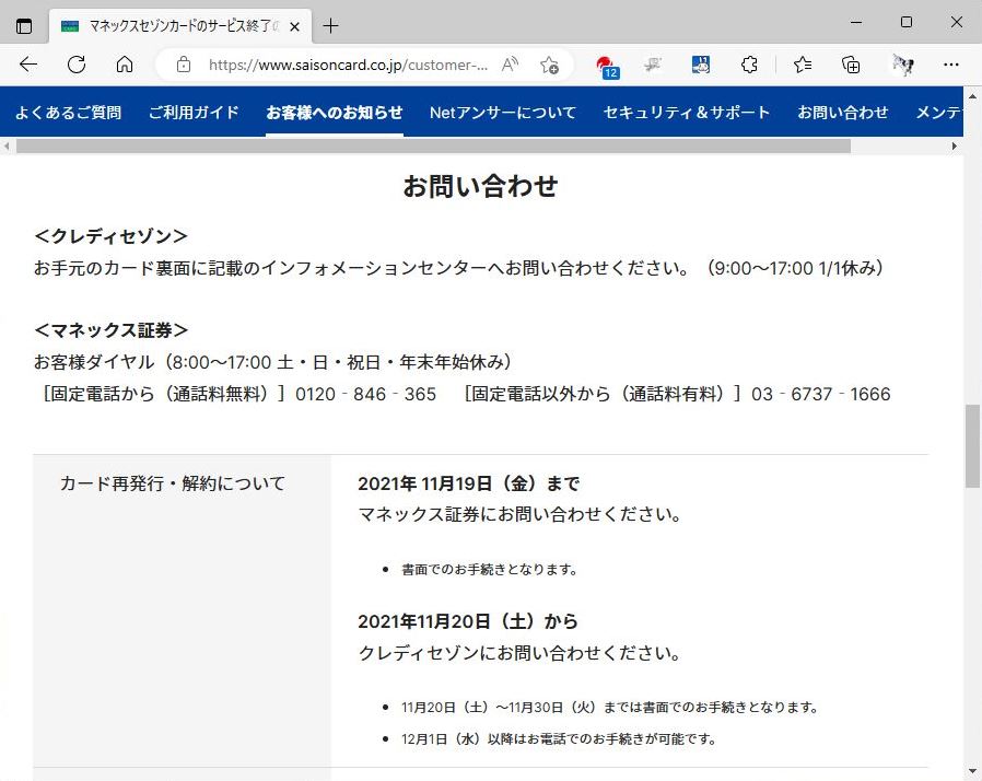 いろいろ調べたが結局カード裏面に記載のインフォメー