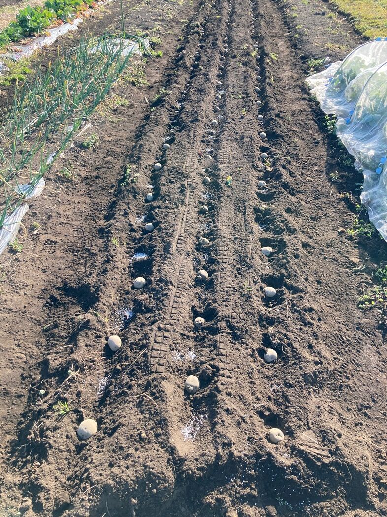 20℃近くまでの陽気に誘われてじゃが芋の植付けを終えた。