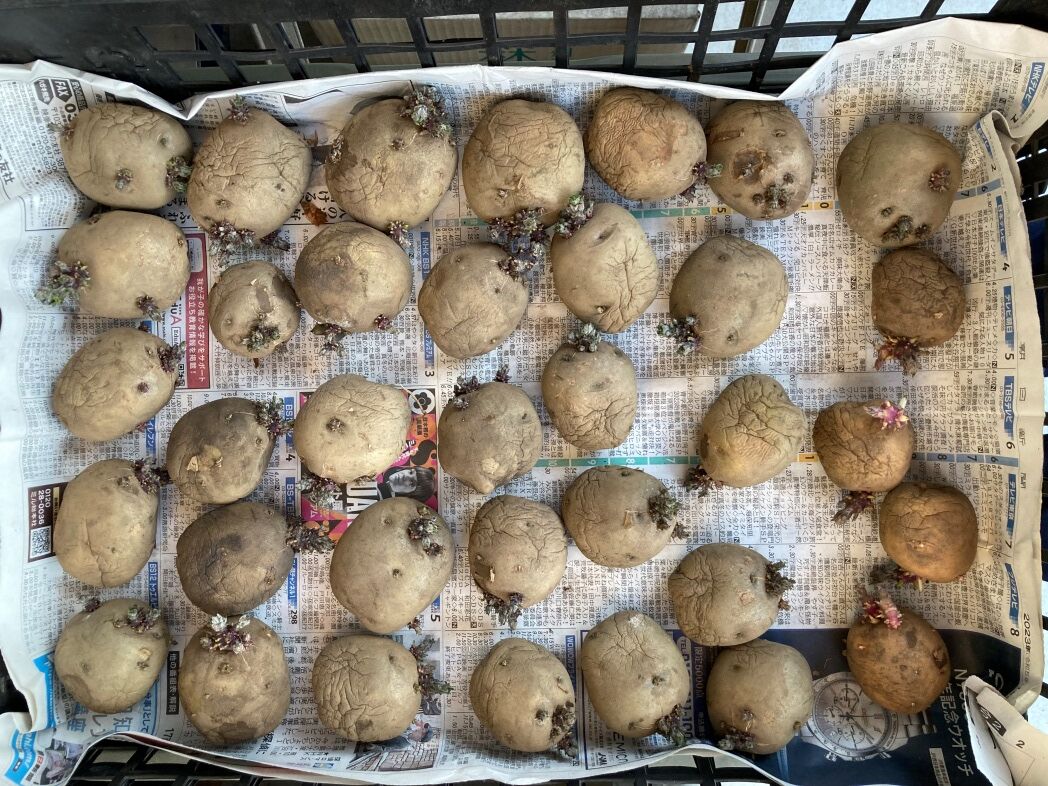 前年度産の発芽じゃが芋 35個あり。JOY本で 2023/01/21に見かけた種芋( 3Kg48個入)を購入したが、10m長の畝に 40cm間隔 2条植えだと必要個数は 50個なのでどう使い分けるか?