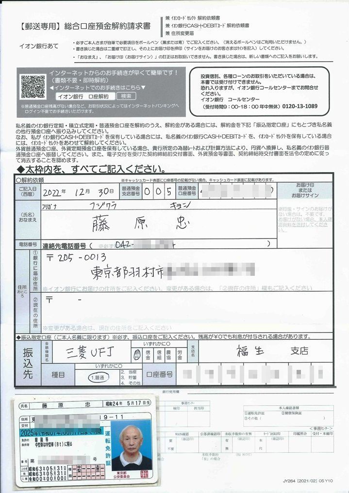 ②AEON銀行総合口座預金解約請求書を返送。 2022/12/30