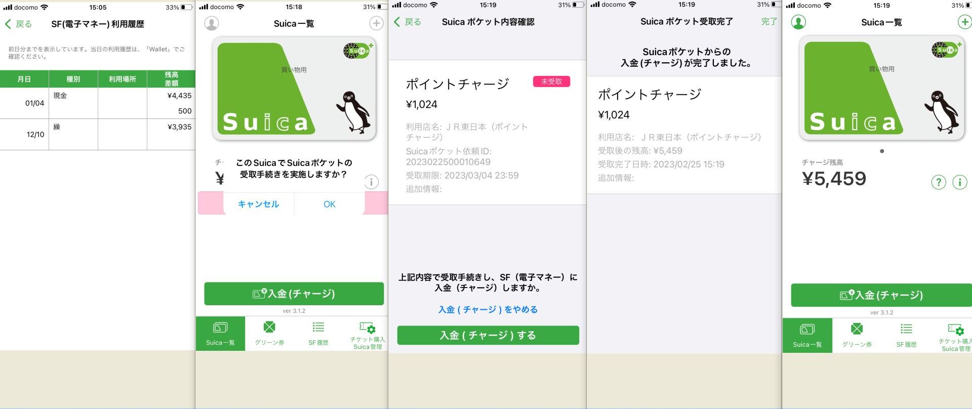 01/04に500円、02/24に1,024円をチャージ完