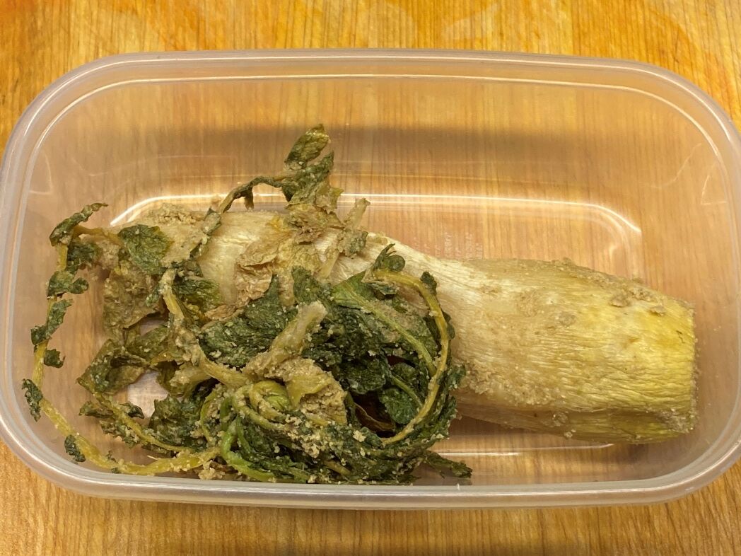 2週間後の干し大根は 2.73Kgしかなかったのでザラメと塩は 100g弱ずつ。余った米糠 2kg(2袋)は畑に散布しよう。