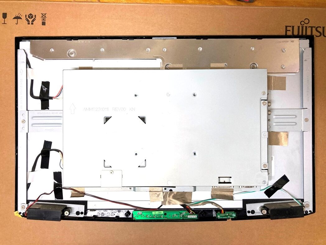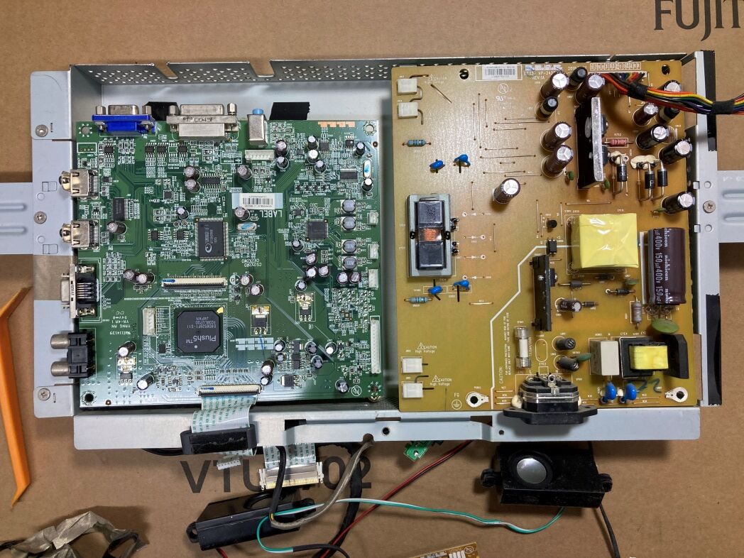 見える範囲のネジを取り、底面からベゼルのクリップ嵌合を外していく。ケーブルのコネクタを外しながら金属ケースを取ると制御基板と電源基盤が露になる。