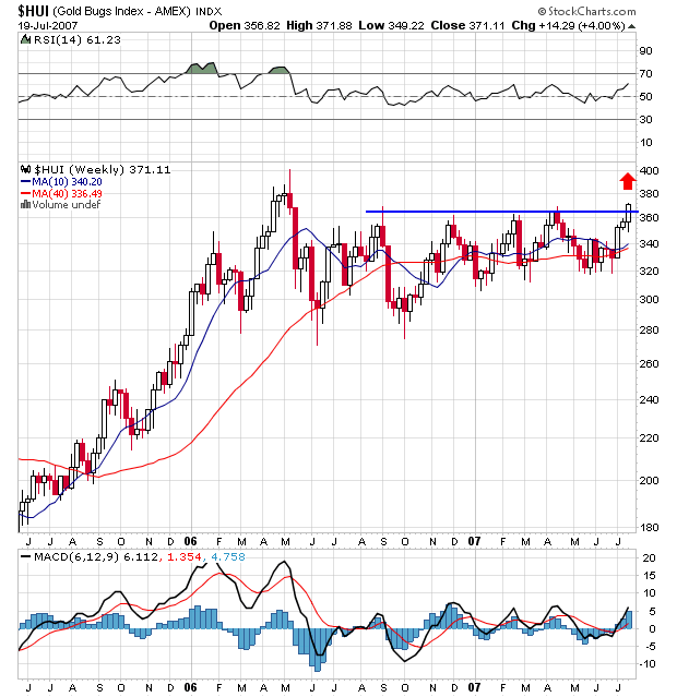 金鉱株がしばしば金を引っ張っており、この命題において”Gold Bugs"と呼ばれているHUIの動きが重要です。最近、私はHUIの4つのトップに注目しています。これら4つはすべて370のエリアの中にあります。HUIは昨日反発し、4つのトップを上抜け371.1で引けました。2006年5月以来の高値で引けました。次の上値目標は、2006年5月の394.22です。