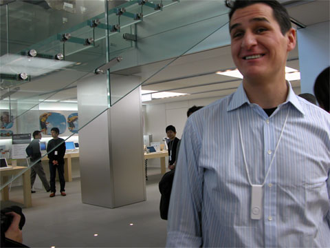 米国ではすでにいくつかの Apple Store にガラスの階段が採用されてるけど、地面に接地しているのが一番下の段の側面にある 4 つの金属の土台だけってのは、名古屋が初みたい。あと、ロンドンにオープンしたばかりの Apple Store Regent Street が初めて採用した、ルーバー状の天井と人口の空の光そのものに、青、白 2 色の蛍光灯を天井に埋め込んだのは名古屋が初だそうです。『ルーバー状の天井と人口の空の光そのもの』ってのは、何だかわからん言葉だけど、『ルーパー上の天井から、2階のお客さんの影と光が見えて、まるで空のようだ』ってことか・・・。