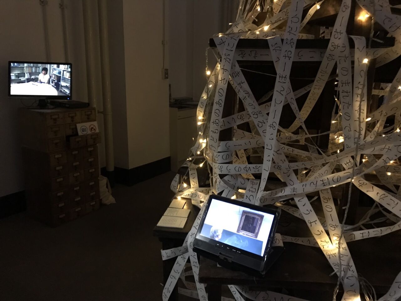 さて、現在AQAプロジェクトは『とはすかたり』の後継となるものを伊都キャンパスで行う計画を進めています。展覧会ほどのサイズの企画にはなりませんが、前回の雰囲気を味わうことができるものを作る予定です。全容を写すことはまだできませんが会場の様子を一場面だけ紹介します。