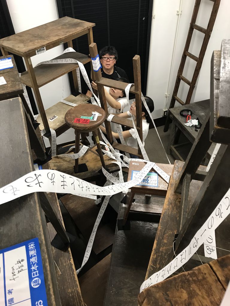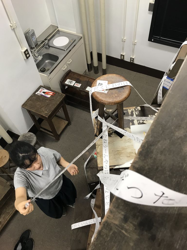お隣の旧同窓会事務室では、前回も存在感十分だった《ひらがなにするする》の展示作業が行われました。