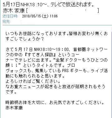 ¡ú2010/5 ·î17 Æü¡Ê·î¡Ë¡§¡È¥¤¥¨¥ä¥¹ÀèÀ¸¡É¡ÊÀÖÌڲȹ¯¡Ë¡¦NHK¼óÅÔ·÷¥Í¥Ã¥È¥ï¡¼¥¯¤ÇÊüÁ÷