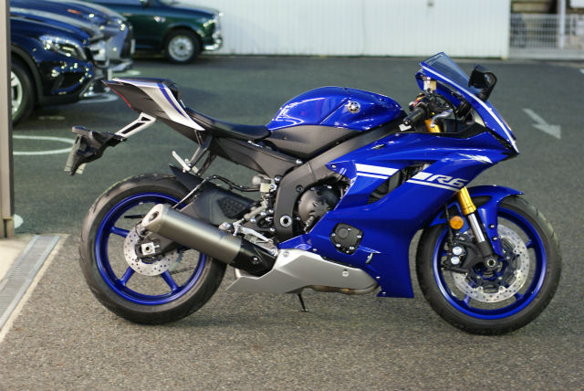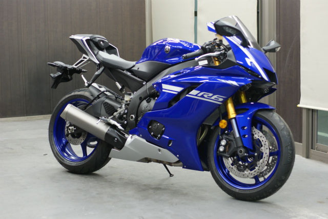 YZF−R6の入庫です。とてもレーシーなこちら。ホイールの色合いがとてもオシャレですね。ほぼ毎日乗られるとのことで汚れを気にされていますがしっかりサポートいたしますのでご安心ください。