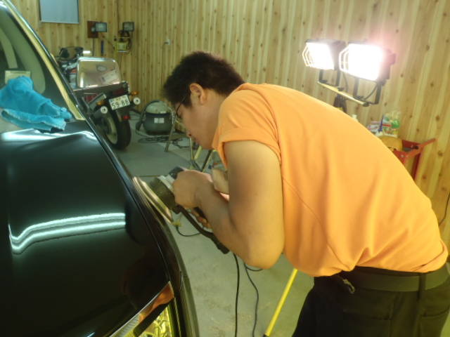 磨き作業開始です!傷をキレイに取り除いていきます。ボディーガラスコーティングを施工しているため塗装までダメージが達しておりません!施工していなければ間違いなくクリアー層を削り塗装にダメージを与えていたと思います。