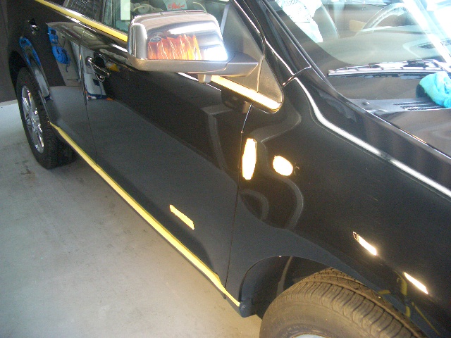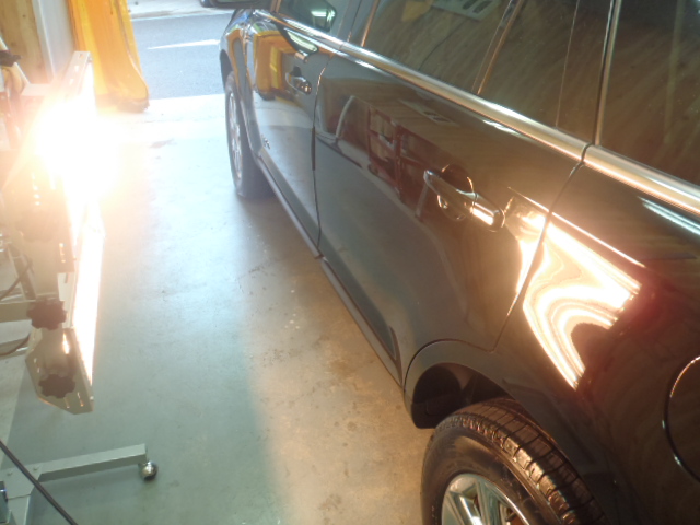 フェンダーから前のドアまでは軽度の傷だったためメンテナンスつや出し剤で仕上げていき、後ろドアからリアクウォーターまでは深い傷で磨きこんだためコーティングを再施工致します。