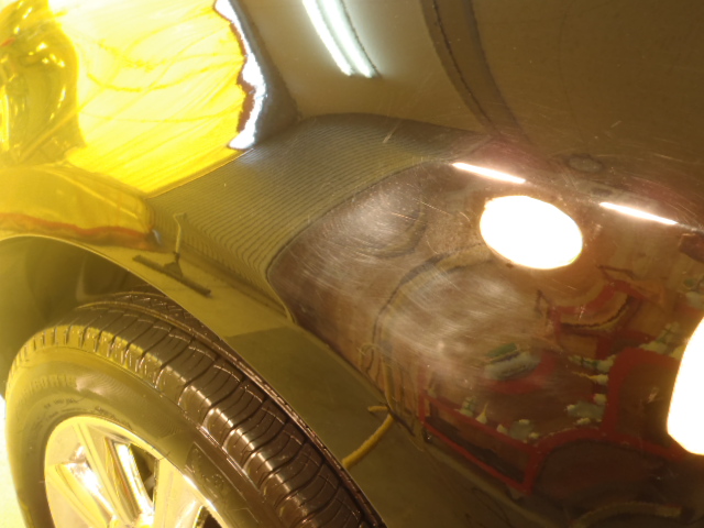 しっかり水気を取り除いたらボディーチェックです。フェンダーからリアクウォーターまで傷が付いております。特にリアクウォーターの傷が深いようです。コーティングの再施工が必要です。