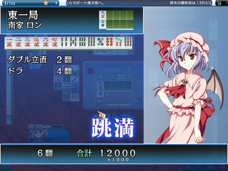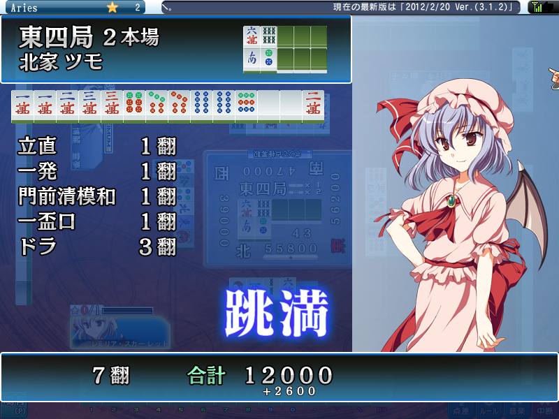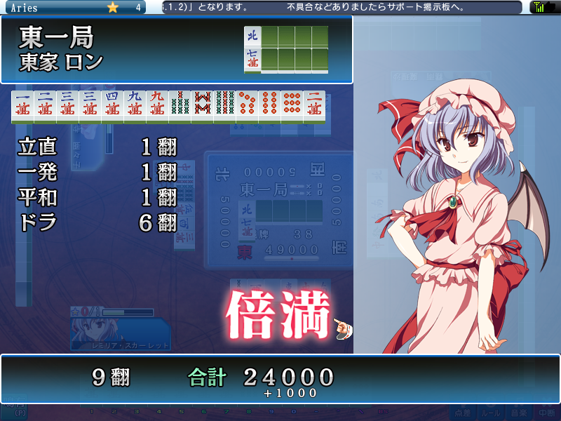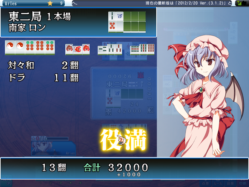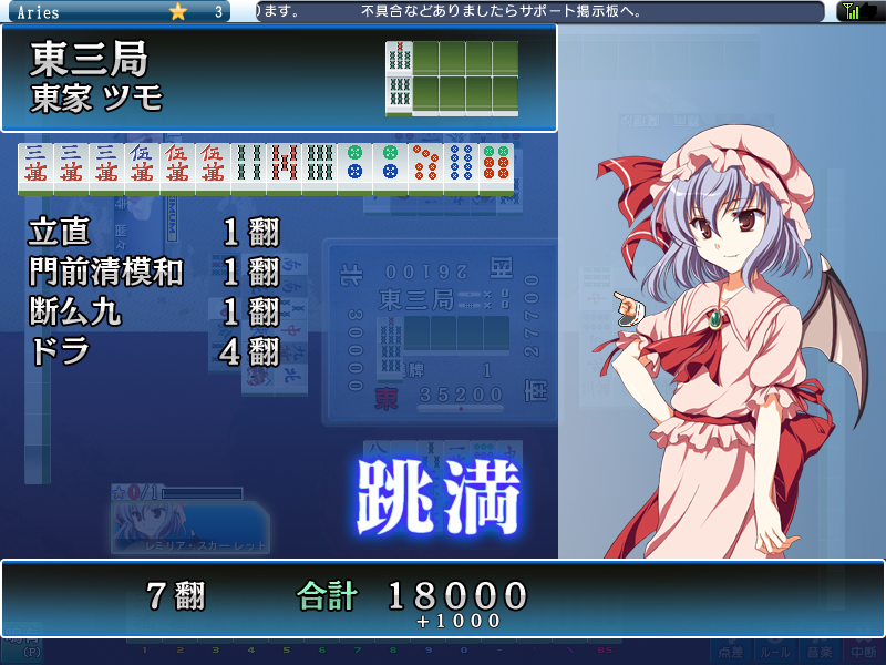 まあ、数え役満ですが。ドラ11なんて自分初めて見ましたよ。あ、卓は背景でわかると思いますが霧雨です。だから赤ドラが大量に載ったわけですね。まあレミリア使ってたからというのもありますが。