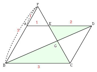 例題2:左の図の平行四辺形で、辺AD上にAE:ED=1:2となる点Eをとり、CEとBAの延長との交点をFとする。また、BDとCFとの交点をGとする。このとき、次の問いに答えなさい。