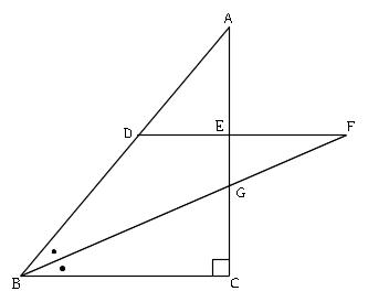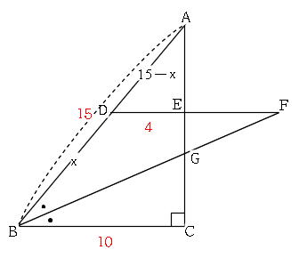 例題3:左の図のような、∠C=90度の直角三角形ABCがある。点D、EはそれぞれAB、AC上の点であり、DE//BCである。また、点Fは、∠ABCの2等分線とDEを延長した直線との交点であり、点Gは、BFとACとの交点である。このとき、次の問いに答えなさい。(佐賀県の問題を一部改題)