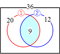 この例題は、20+12=32は両方とも正解の人数9人を1回だけダブって数えているから、36-(20+12-9)=13と、「頭で」考えても解くことができます。