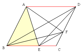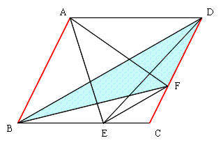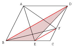例題4:図の平行四辺形ABCDで、BD//EFである。このとき、△ABEと面積の等しい三角形をすべて書きなさい。