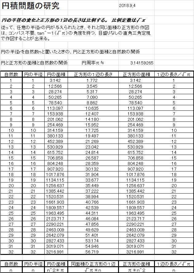 つまり、半径rの円が与えられれば、一角がtan^-1(√π)の角を持つ直角三角形を当てるだけで求める正方形の1辺の長さは、計算以前の問題として自動的にしかも数値では表す事が出来ない長さを直接表す真値が得られるのである。