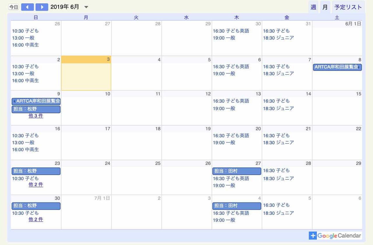 毎月、前月の20日前後にARTCAのHPの岸和田教室のカレンダーに担当の先生を記載しました。
