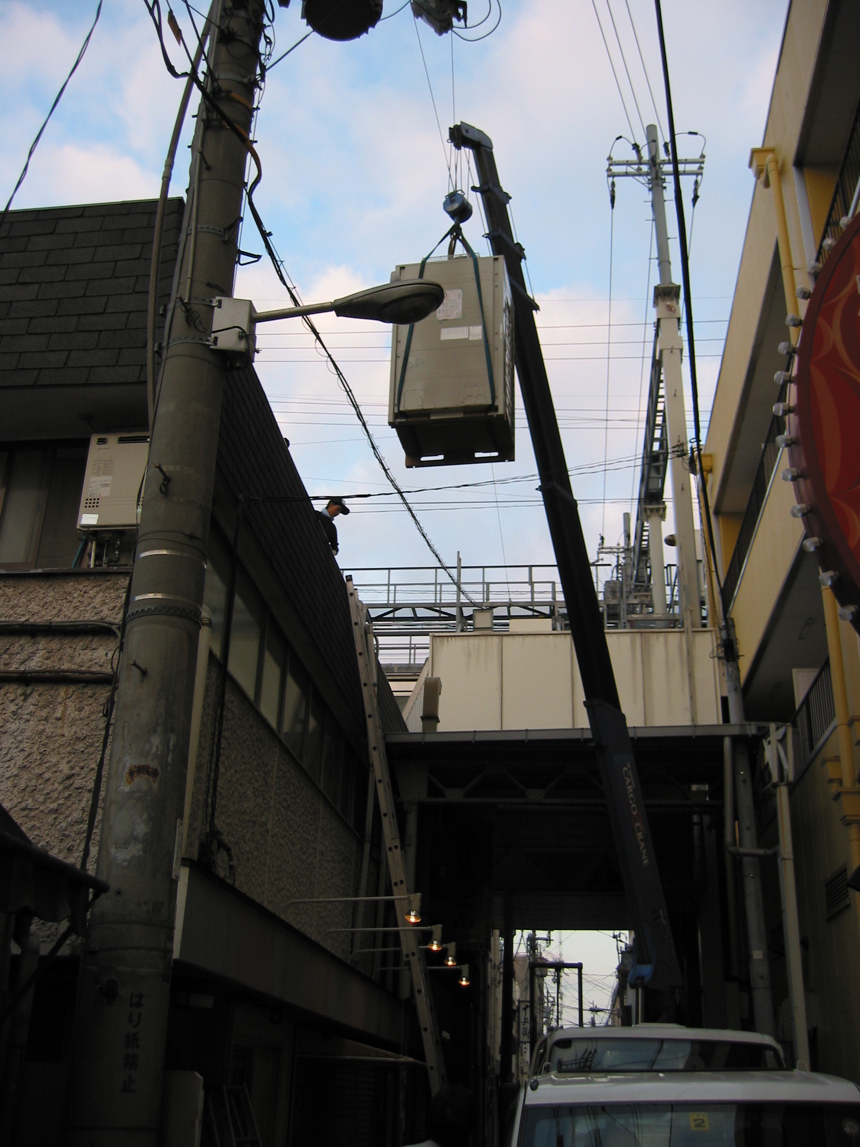 室外機を屋根の上に上げる為、夜明けすぐに、レッカーで作業しているシーンです。