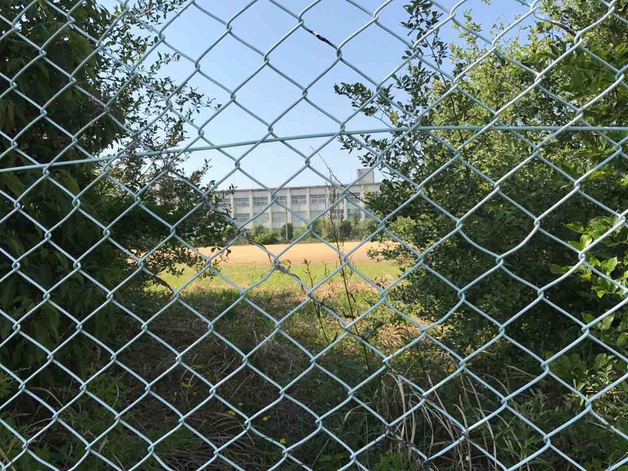校門。二重の囲いになっている点は異様に映るが、手前の物々しいフェンスさえなければ普通の学校の風景だろう。
