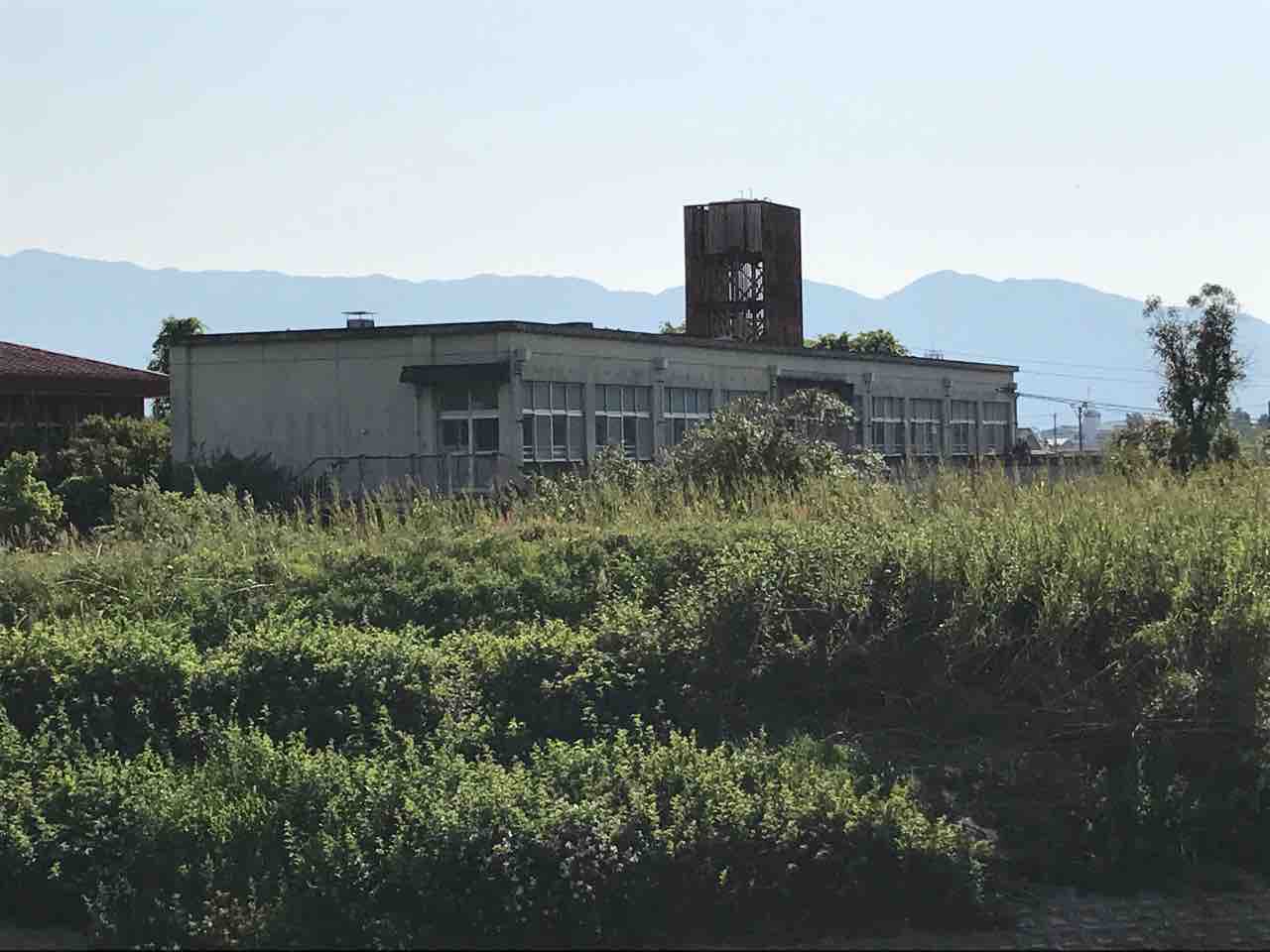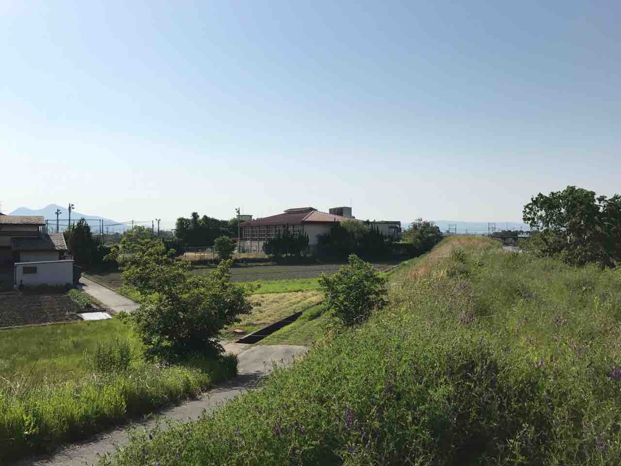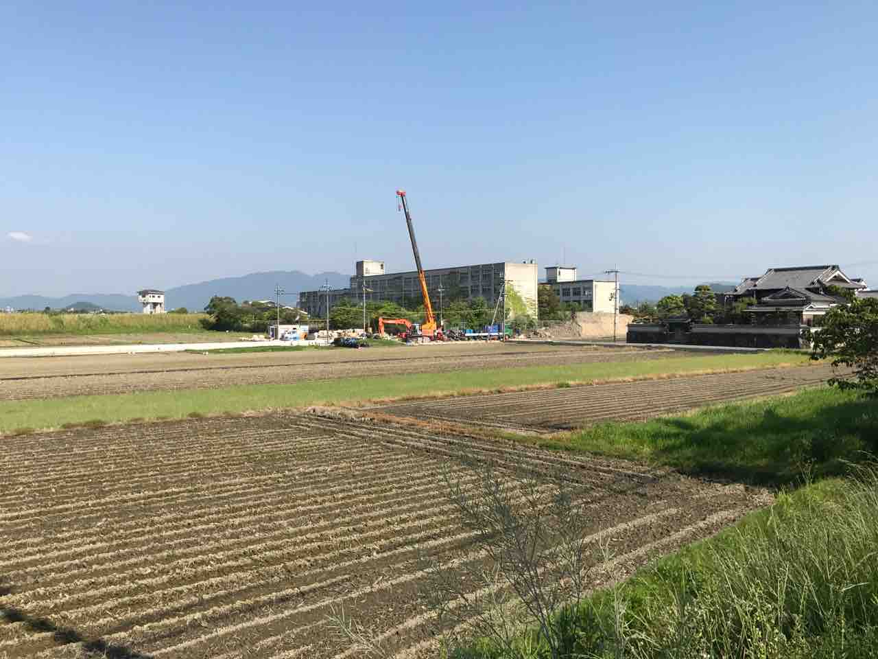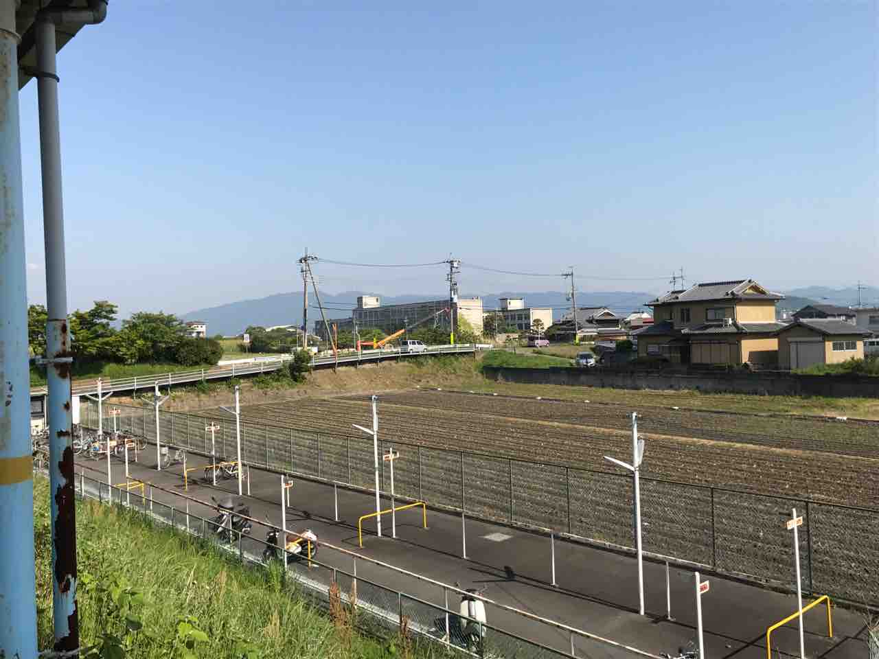 田畑が広がる近鉄某駅、その改札から見えるひときわ大きな建物がかつての高田東高校だ。