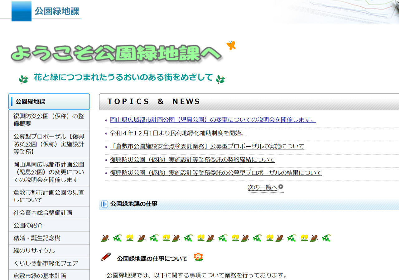 (公園緑地課のページを開けると、👇以下の画面になります。ここから児島公園の文字を見つけなければなりません。色が付いているのは私が開けたからで、最初から目立つ着色がされているわけではなりません。)