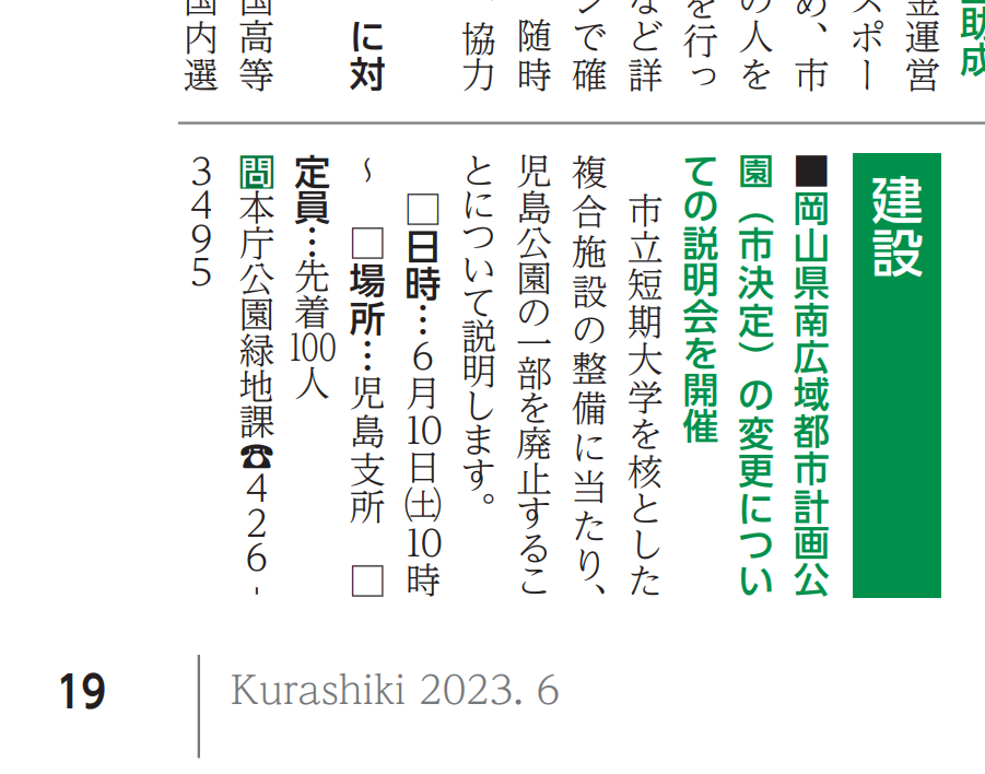 タイトルからはほとんど読み取れませんが、内容は児島地区の市立短期大学の駅前の児島公園への移転についてがメインとなります。
