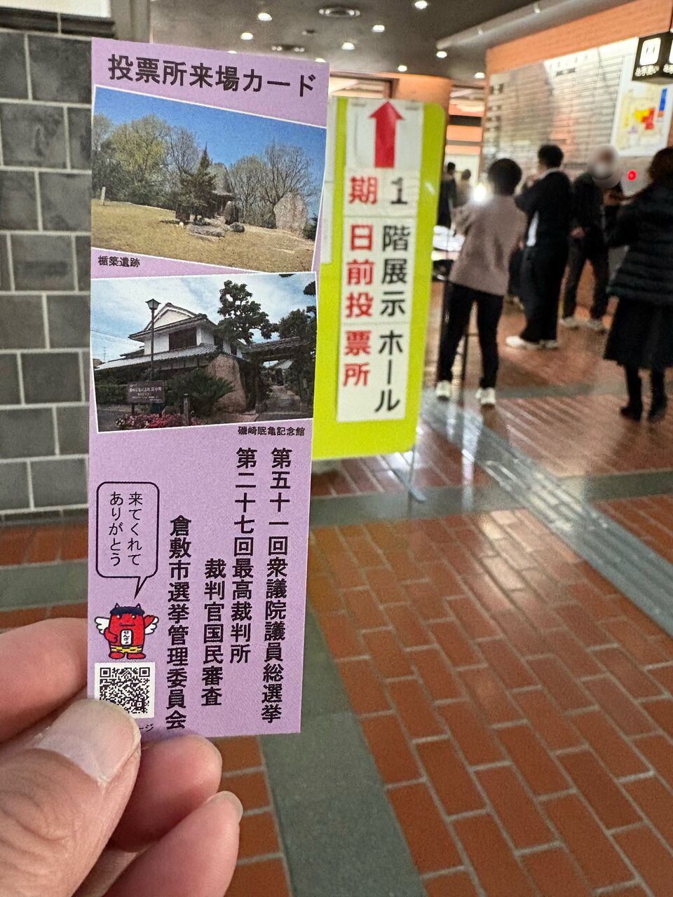 (今回の投票所来場カードは、庄地区の楯築遺跡と茶屋町の磯崎眠亀記念館です。)